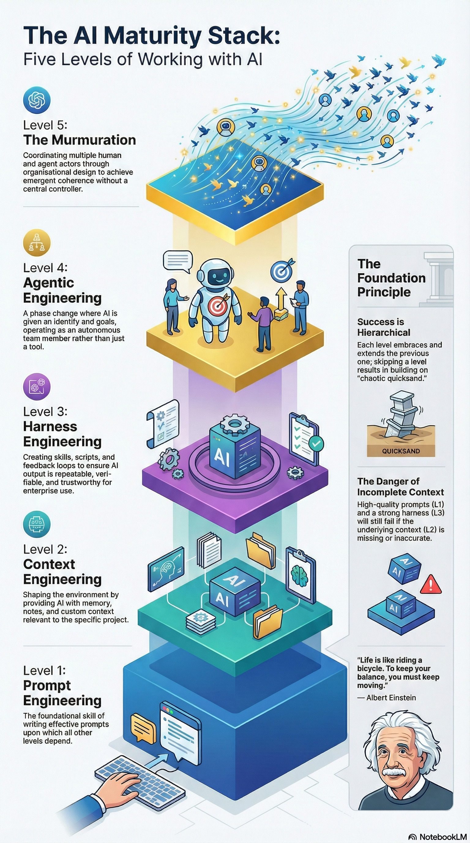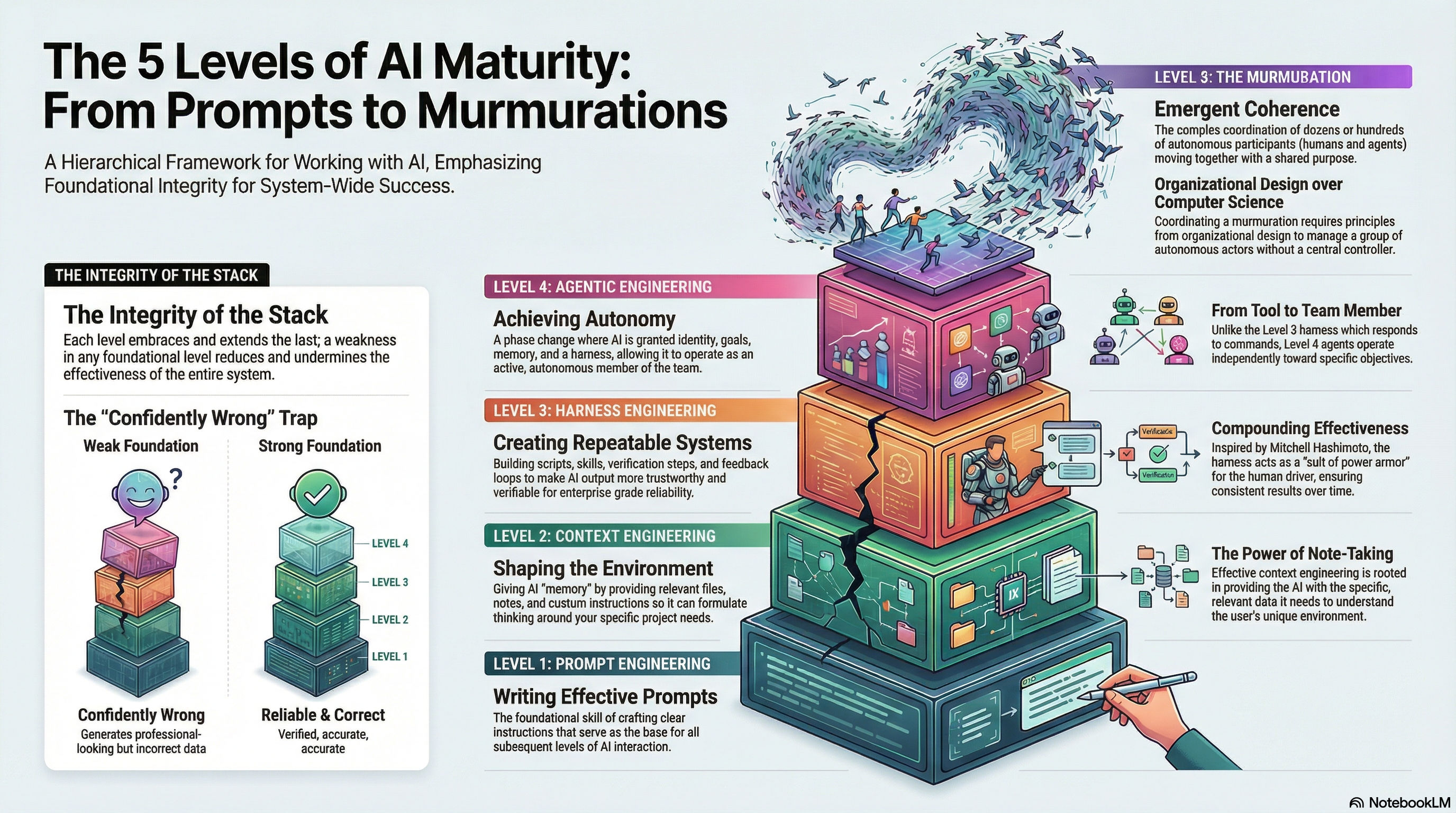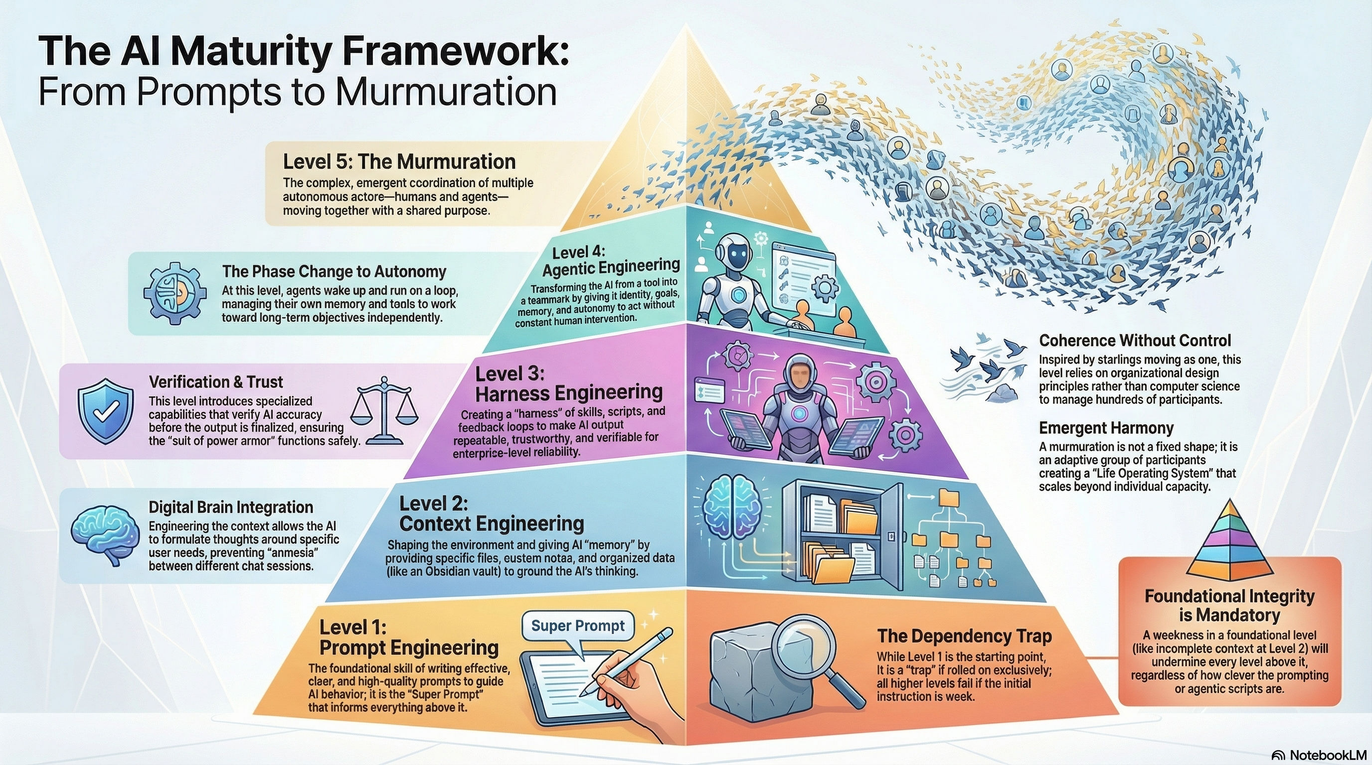 Level 5: The Murmuration – The complex coordination of multiple autonomous actors (both humans and agents) moving together with emergent coherence and a shared purpose, drawing on principles from organizational design.